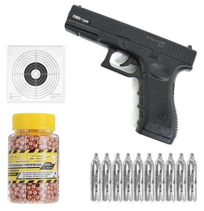 10 цен на Пневматический пистолет Stalker S17 (Глок) / Пневматический Glock 17 / Шарики 1500шт. / Баллончики CO2 10шт. / Мишени 50шт.