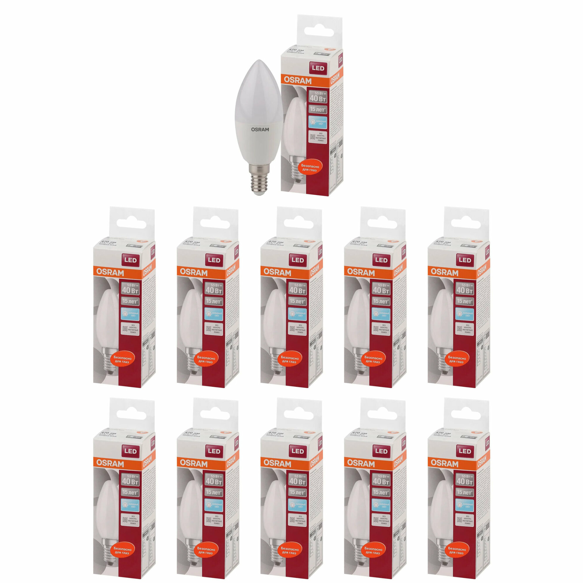 10 цен на Лампочка светодиодная OSRAM Свеча B E14 5Вт 220В 470Лм 4000К Дневной белый, упаковка 10шт