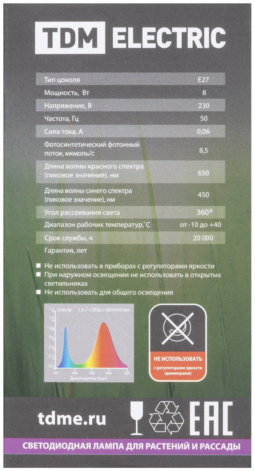 Лампа светодиодная фито A60-8 Вт-230 В-E27-CL 60*108 мм TDM информация: