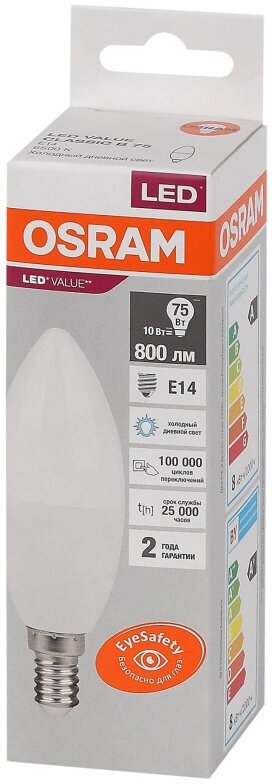 Отзывы на Светодиодная лампа OSRAM LED Value, B, E14, 800Лм, 10Вт, замена 75Вт, 6500К, холодный белый свет 4058075579262