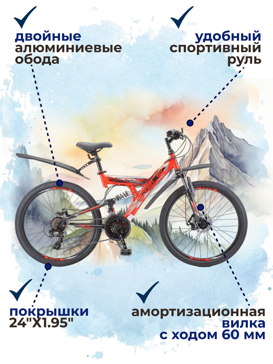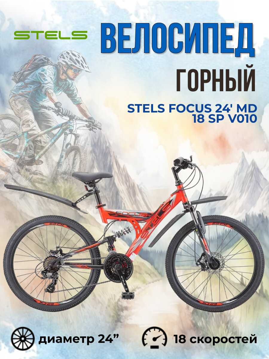 Велосипед подростковый горный Stels Focus с колесами 24" MD 18 sp V010 красно-чёрный рама 16" информация: