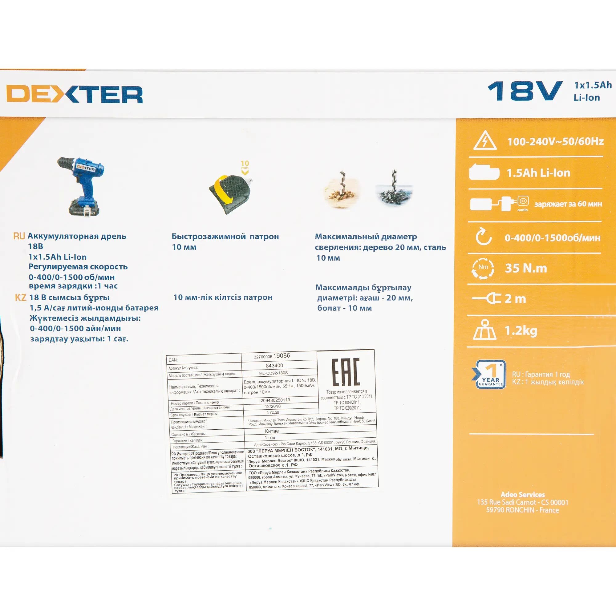 DEXTER Дрель-шуруповерт аккумуляторная Dexter ML-CD92-180S, 18 В Li-ion 1.5 Ач информация: