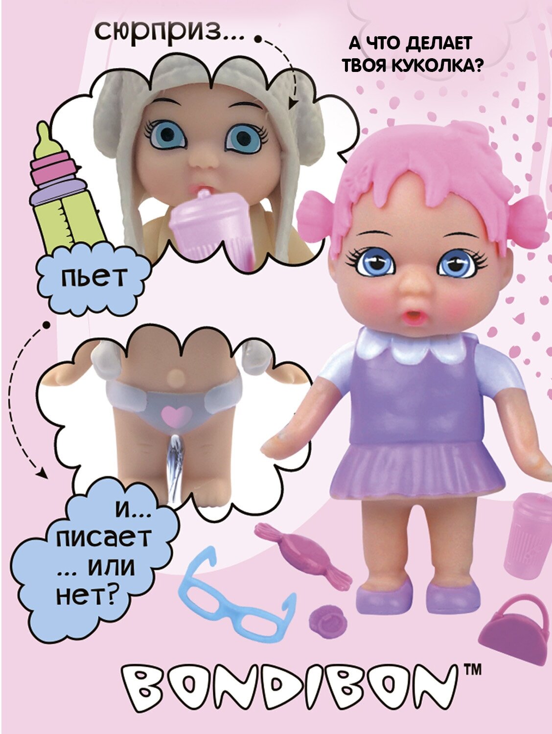 | Комплектация | - пупс; - бутылочка; - соска; - сумка; - очки; - конфета. |