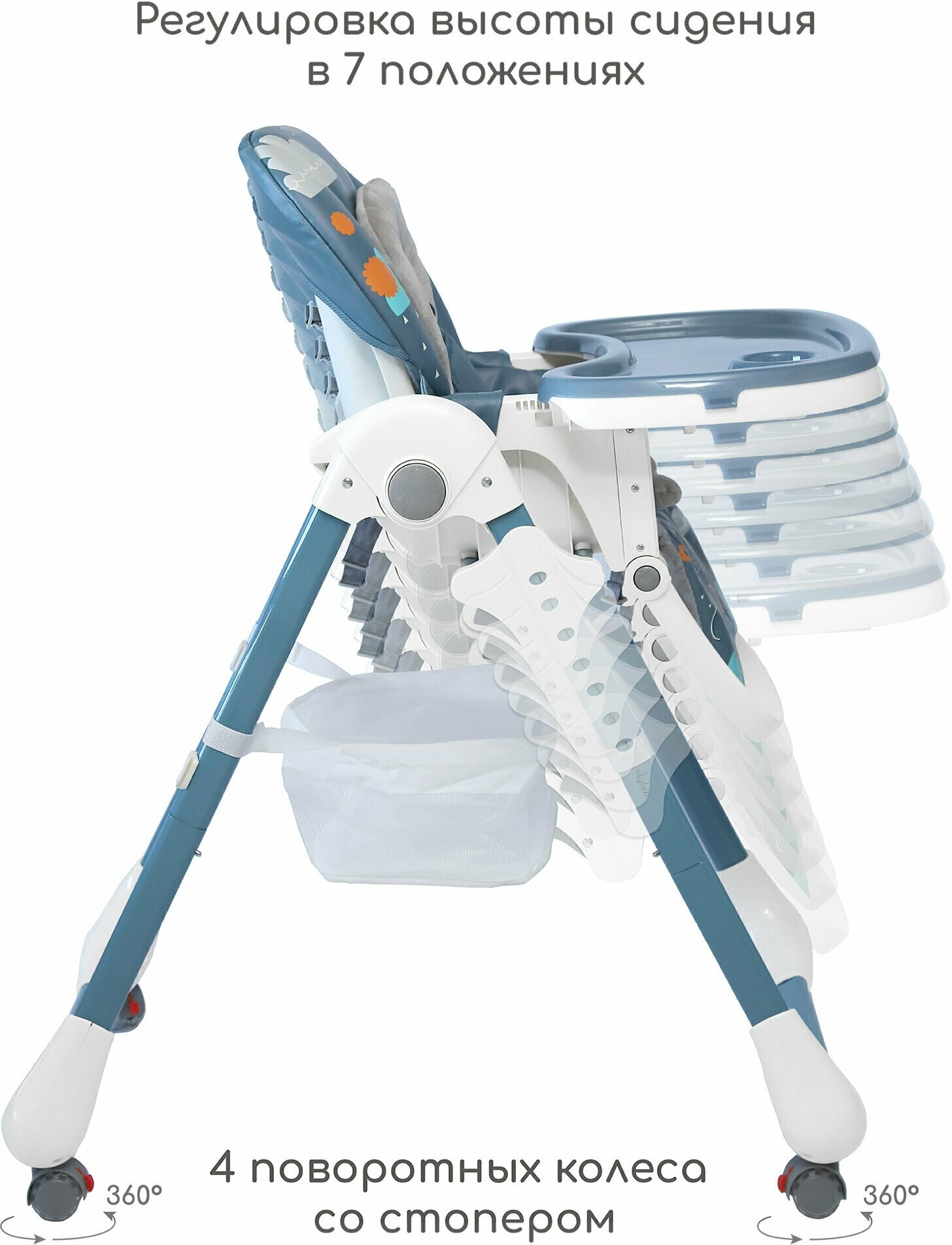 Регулировка | высоты стульчика / наклона спинки / положения подножки / положения столика |