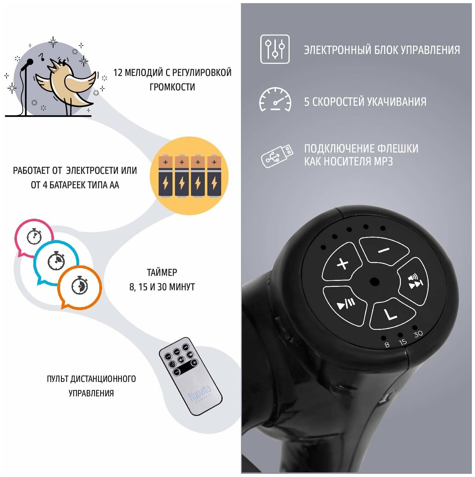 Функции | автоотключение укачивания / горизонтальное положение спинки / моющееся сиденье / режим "качания" / таймер мелодий и звуков / таймер укачивания |