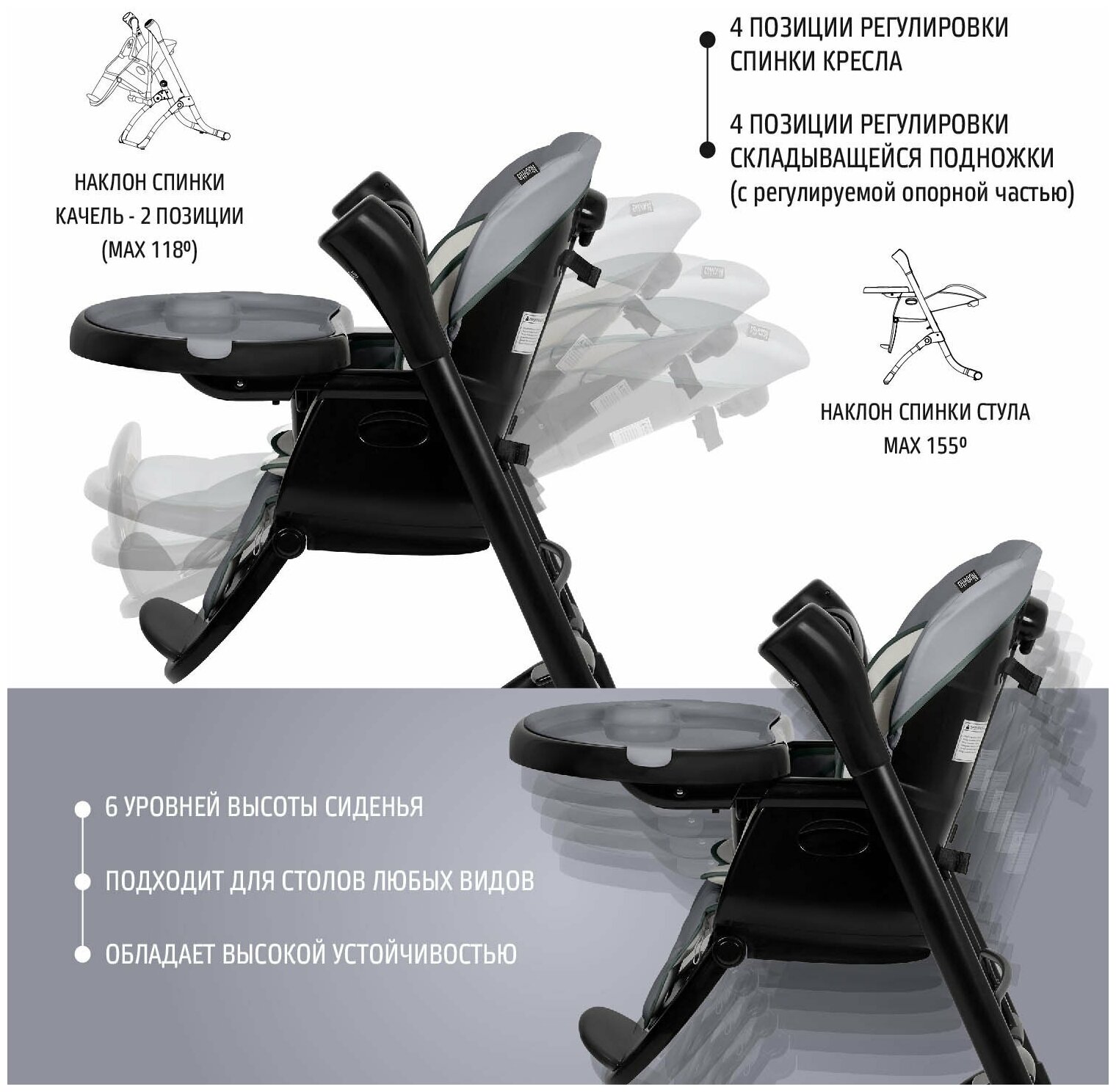 Регулировка | высоты стульчика / наклона спинки / положения подножки / положения столика |