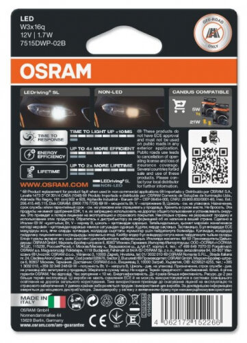 Отзывы на Лампа W21/5W 12V 1,9W LEDriving, 2шт. блистер OSRAM 7515DWP02B