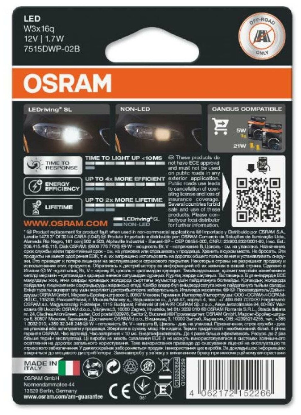 Отзывы на Лампа светодиодная OSRAM W21W/5W, W3x16q, LED, 2 шт., 6000 К, 12 В 7515DWP-02B
