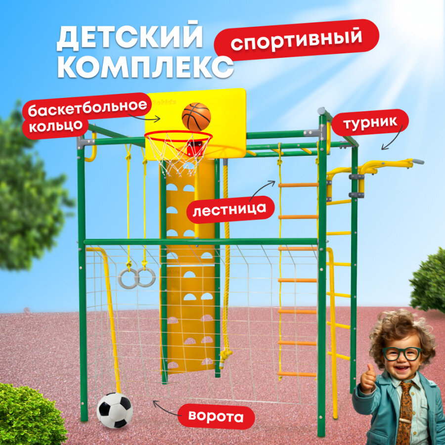 | В комплекте | баскетбольное кольцо, веревочная лестница, ворота, гимнастические кольца, канат, рукоход, скалолазная стенка, турник |
