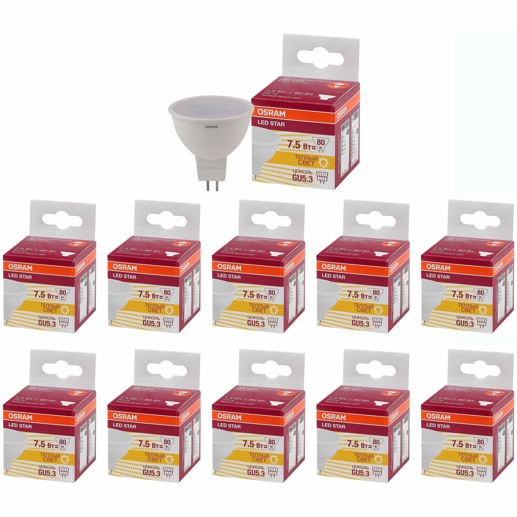 Лампы светодиодные GU5.3 OSRAM LED Star MR16, 700лм, 7.5Вт, 3000К, теплый свет, MR16, софит, набор 10 шт 3 751 ₽