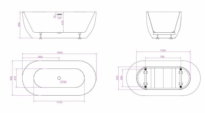 Ванна Ceruttispa COMO150 акриловая (1500x750x560) отдельностоящая, белая