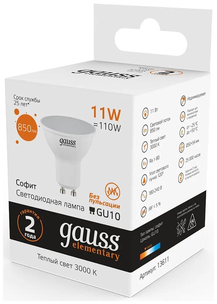 Упаковка ламп 10 штук Gauss Elementary MR16 11W 850lm 3000K GU10 LED 1/10/100 информация:
