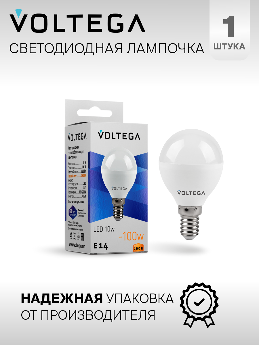Лампочка светодиодная E14 форма шар 10W теплый свет Voltega Simple Globe 2800K 1 штука 210 ₽