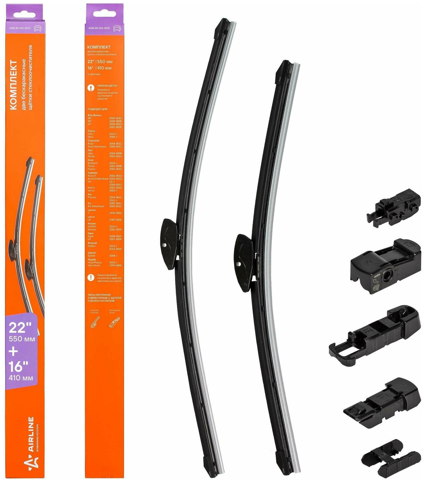 AIRLINE AWBBK550400K Щетки стеклоочистителя бескаркасные 550/410мм 2шт. 2 адаптера