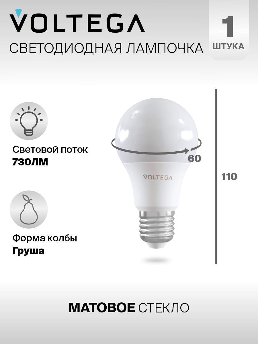 Лампочка светодиодная E27 форма груша 9W нейтральный белый Voltega Simple A60 4000K упаковка 6 штук 1 088 ₽