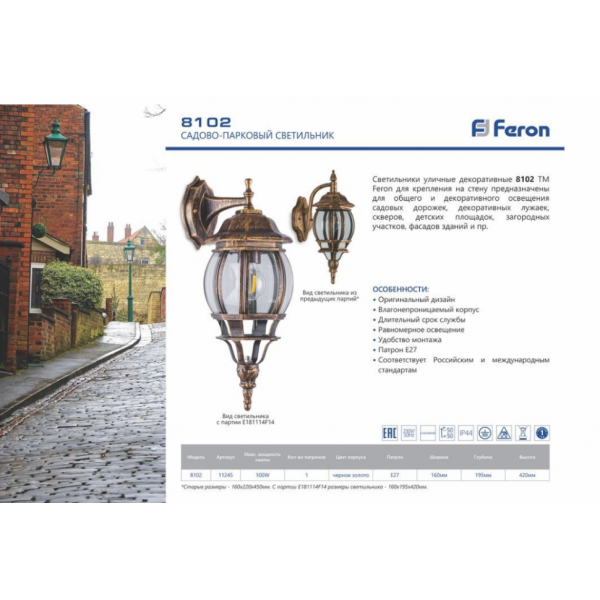 Отзывы на Светильник садово-парковый Feron 8102/PL8102 восьмигранный на стену вниз 100W E27 230V, черное золото