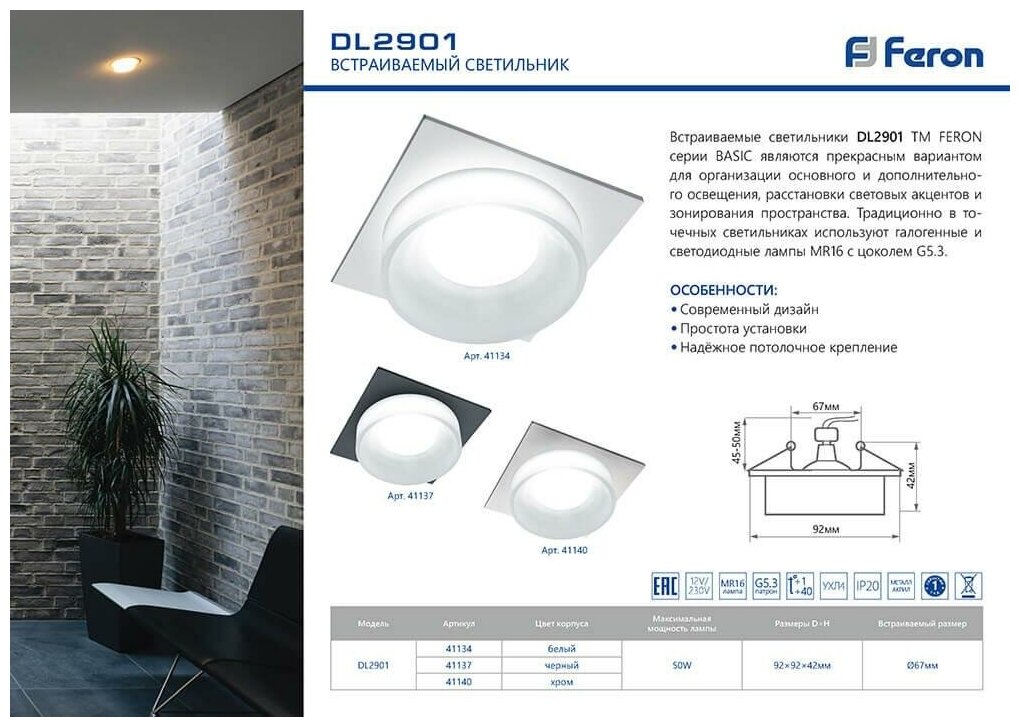 Отзывы на Светильник встраиваемый Feron DL2901 потолочный MR16 G5.3 черный