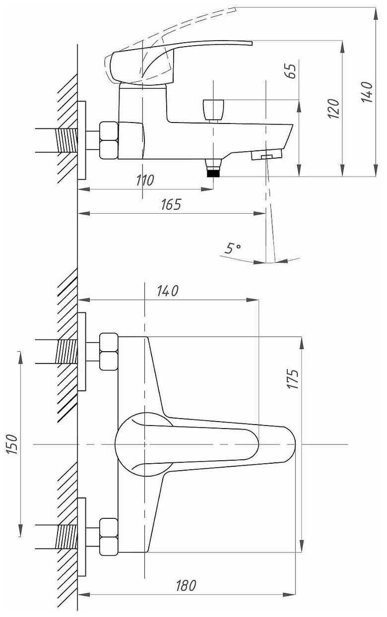 Смеситель на раковину настенный Эверест B46-350 с круглым поворотным изливом, кран-буксы 1/2", хром