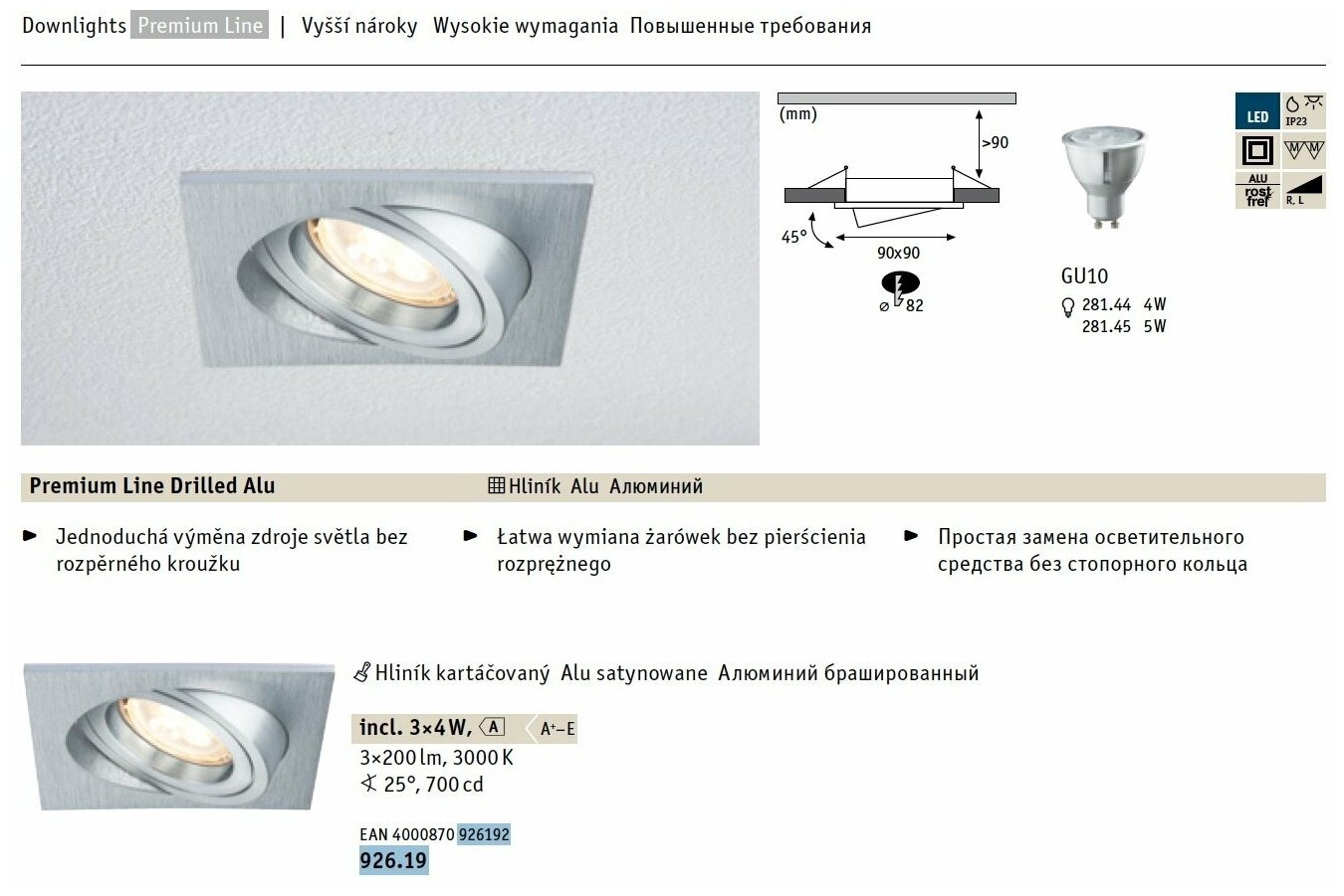 Светильник встраиваемый Paulmann Drilled 4Вт 200Лм 3000К IP23 GU10 LED 90х90мм Алюминий точеный Поворотный Диммируемый Набор 3штуки 92619 информация: