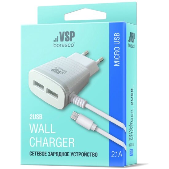 Сетевое зарядное устройство BORASCO 2USB, 2,1A, micro USB, белое информация: