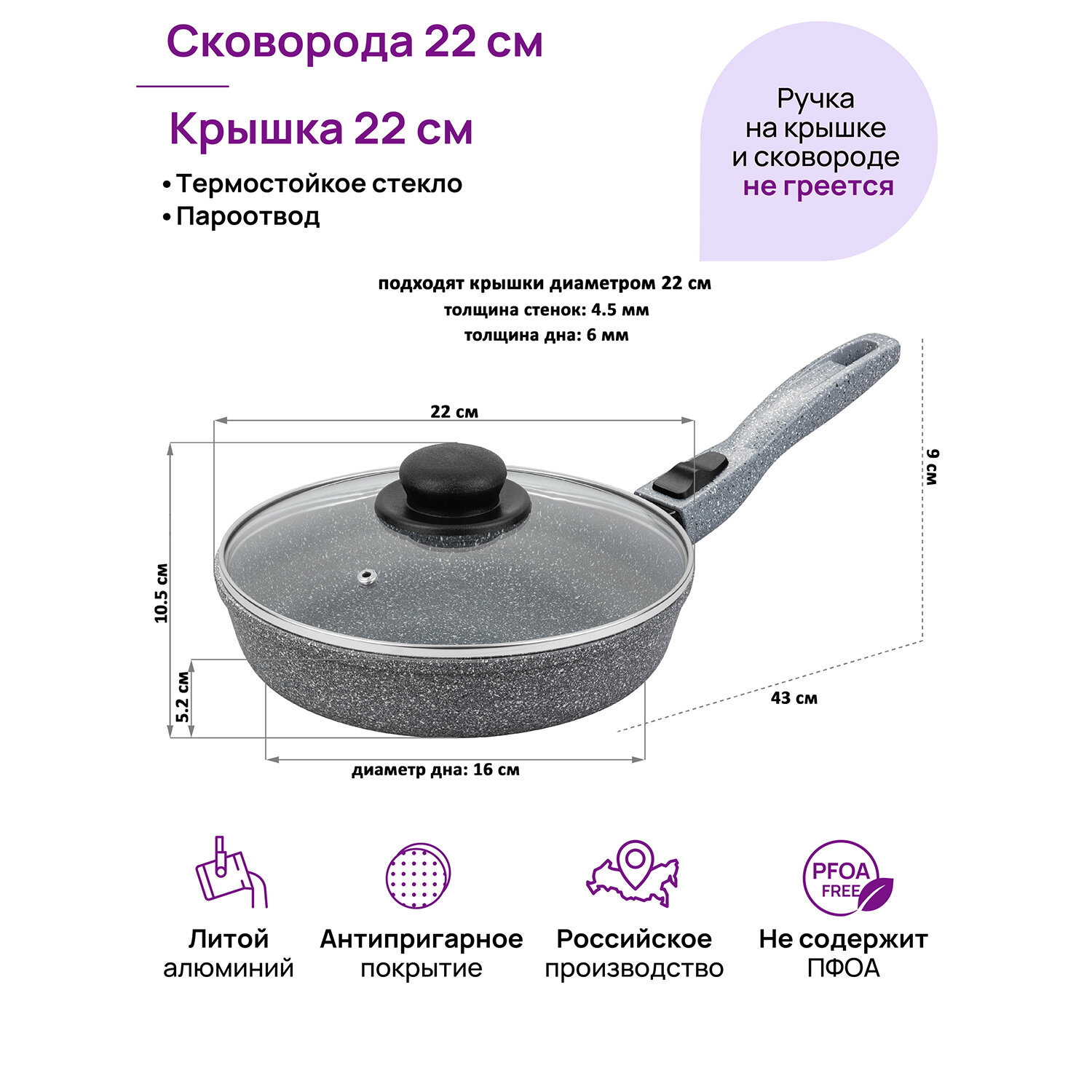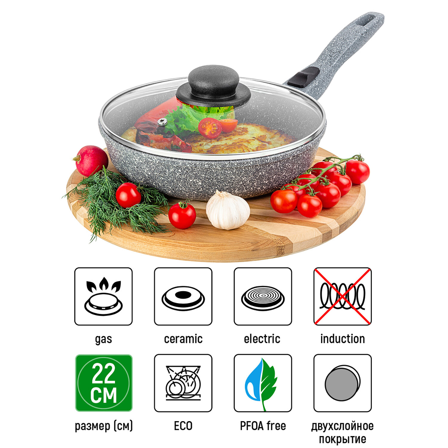 Отзывы на Сковорода глубокая 22 см Elan Gallery гармония вкуса Серый мрамор с крышкой D22, съёмная ручка