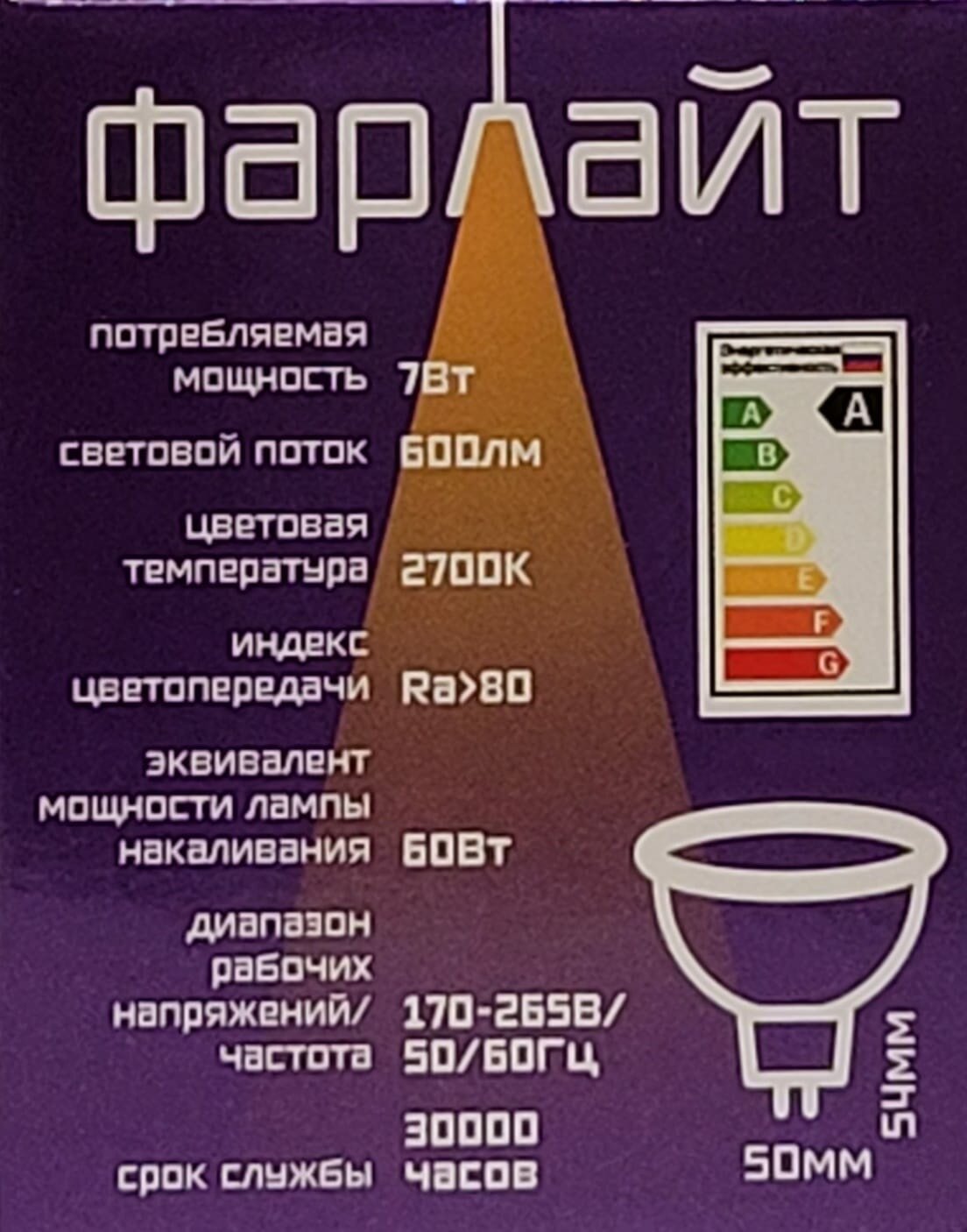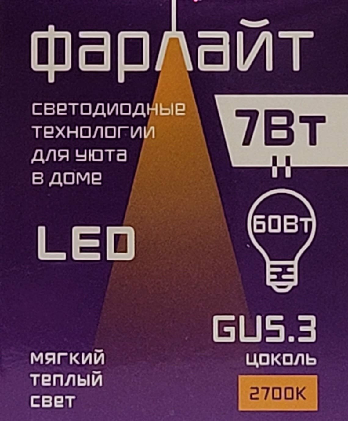 Лампочка светодиодная Фарлайт, мягкий теплый свет, MR16, 7 Вт, 2700 К, GU5.3 (Комплект 4 шт.) информация: