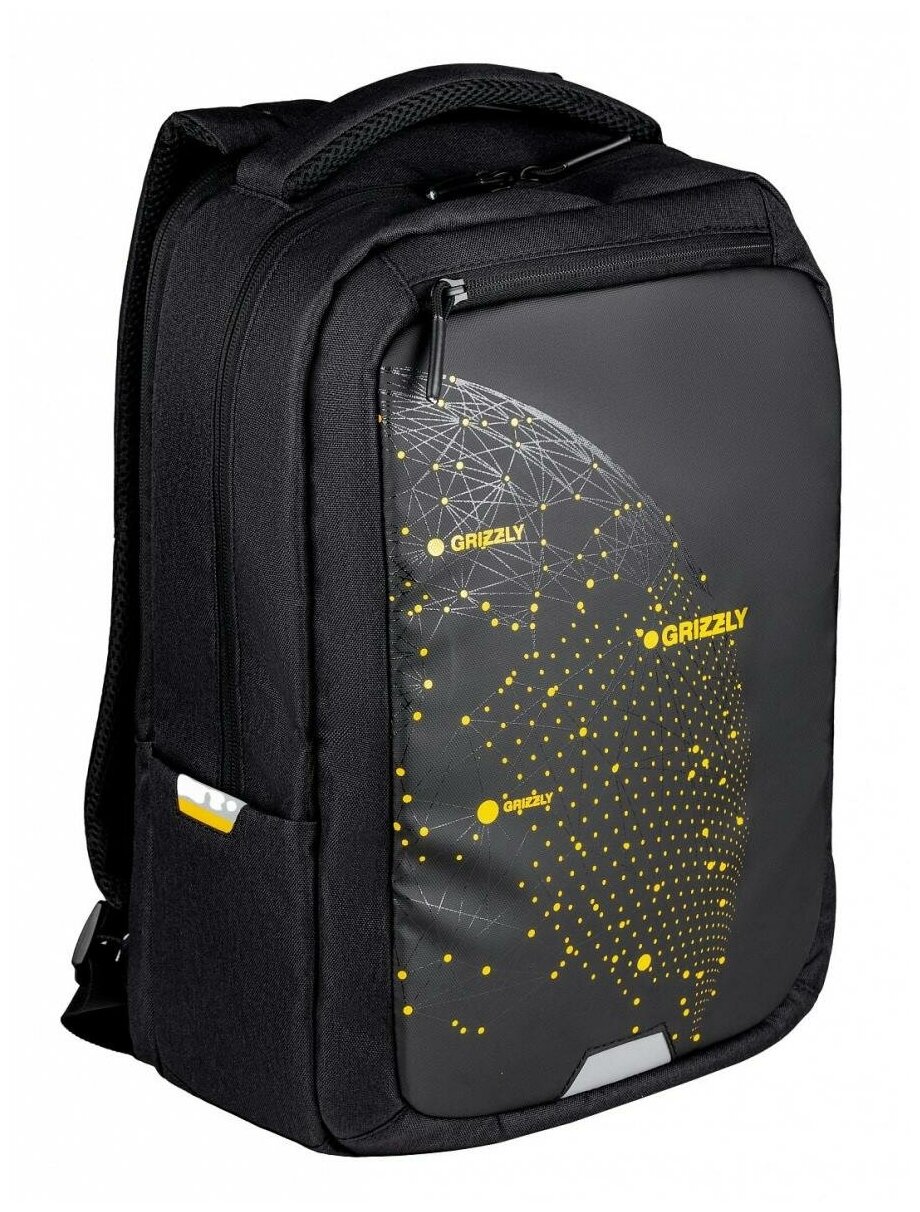 Школьный рюкзак с ортопедической спинкой GRIZZLY RU-234-2 черный - янтарь, грудная стяжка информация: