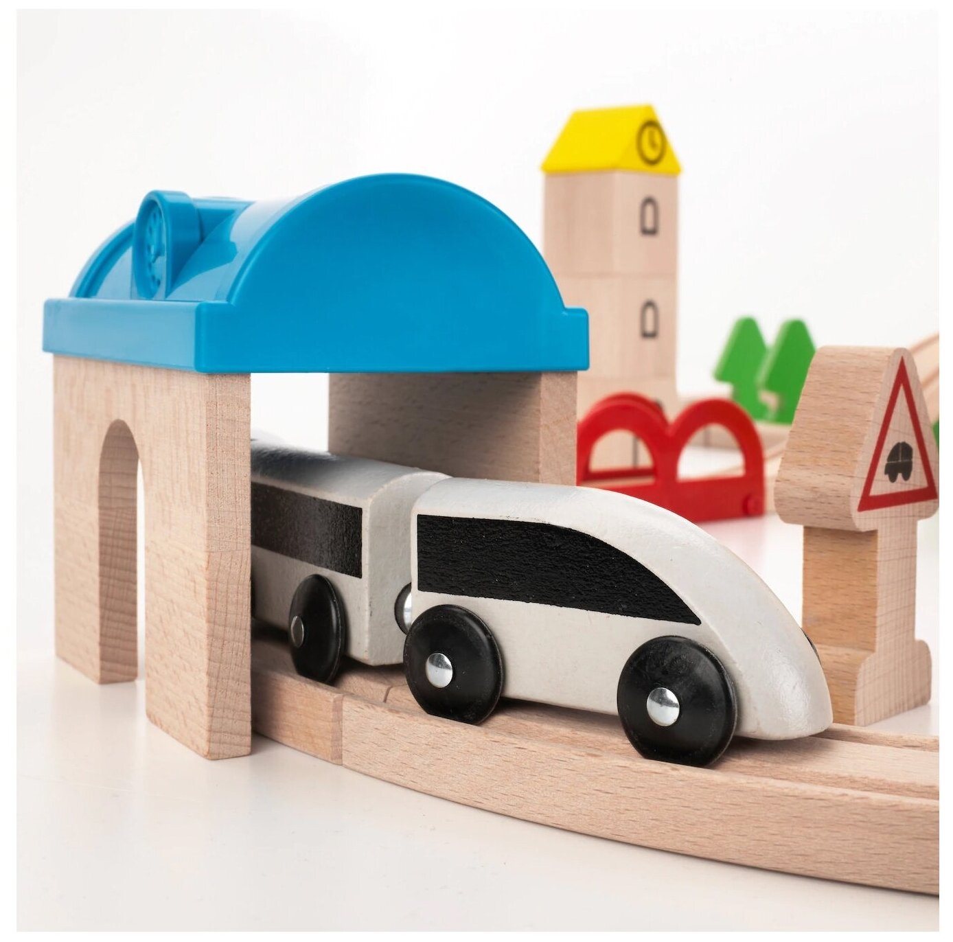 | Дополнительная информация | вагончики соединяются в поезд с помощью магнитов; рельсы: массив бука; средства передвижения/дерево: массив бука, акриловая краска, прозрачный акриловый лак; гвоздь/ось: сталь, гальванизация; колесо: полиэтилен; дом/крыша/столбик: массив бука, морилка, прозрачный акриловый лак; мост/станция: полипропилен; переезд/тоннель: пластмасса АБС; рекомендация по уходу: протирать влажной тканью |