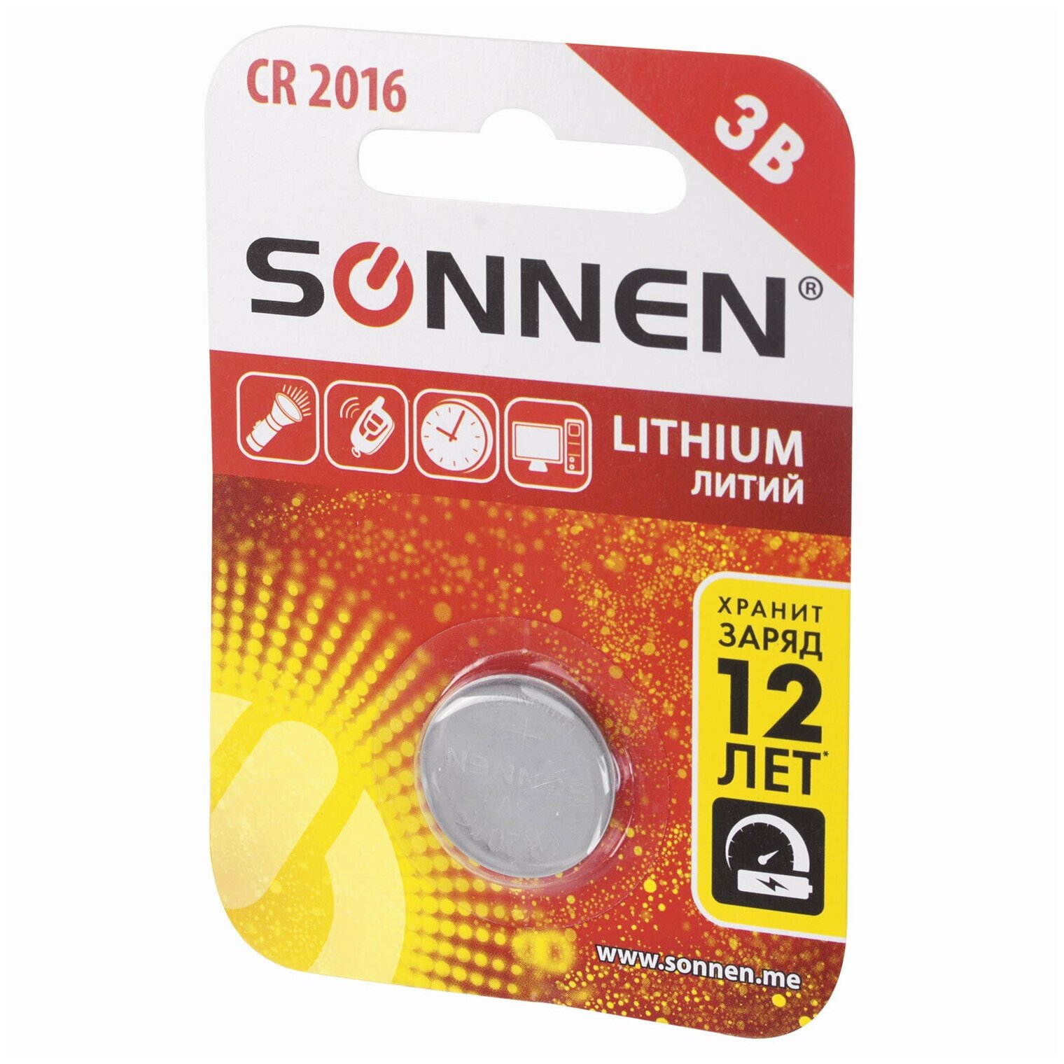 Батарейка SONNEN, CR2016 (таблетка), d=20 мм, h=1,6 мм, литиевая, 1 шт., в блистере, 3 В, 451972