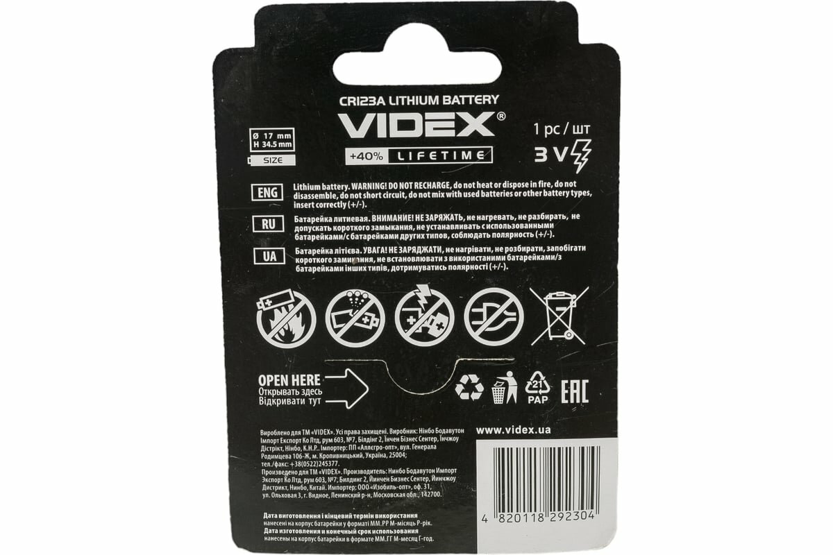 Литиевый элемент питания Videx 1шт. в блистере VID-CR123 информация: