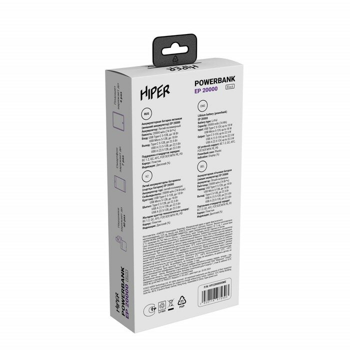 HIPER Внешний аккумулятор Hiper EP 20000, 20000 мАч, 3A, 2 USB, QC, PD, дисплей, черный информация: