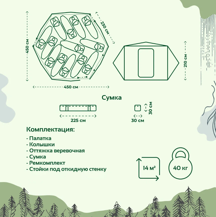 | Ширина внутренней палатки | 450 см |