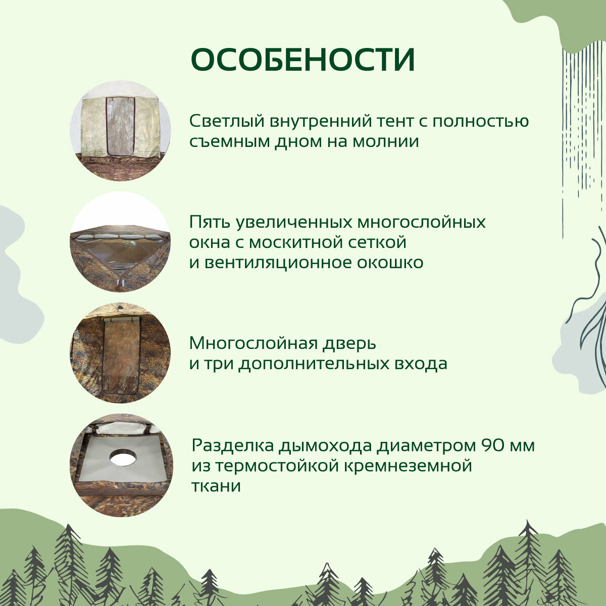 | Особенности | вентиляционные отверстия / ветрозащитная/снегозащитная юбка / внутренние карманы / внутренняя палатка / навес / окна / проклеенные швы / усиленные углы |
