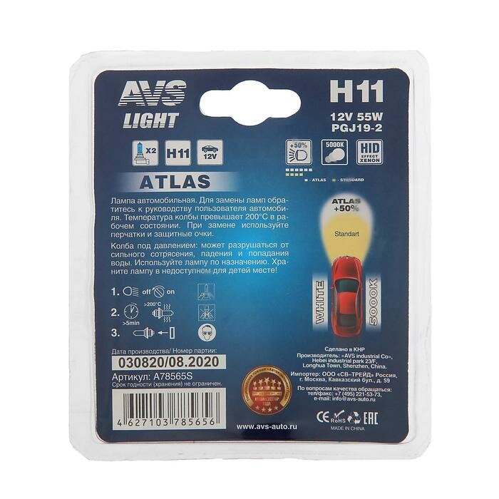 Лампа автомобильная AVS ATLAS 5000К, H11, 12 В, 55 Вт, набор 2 шт информация: