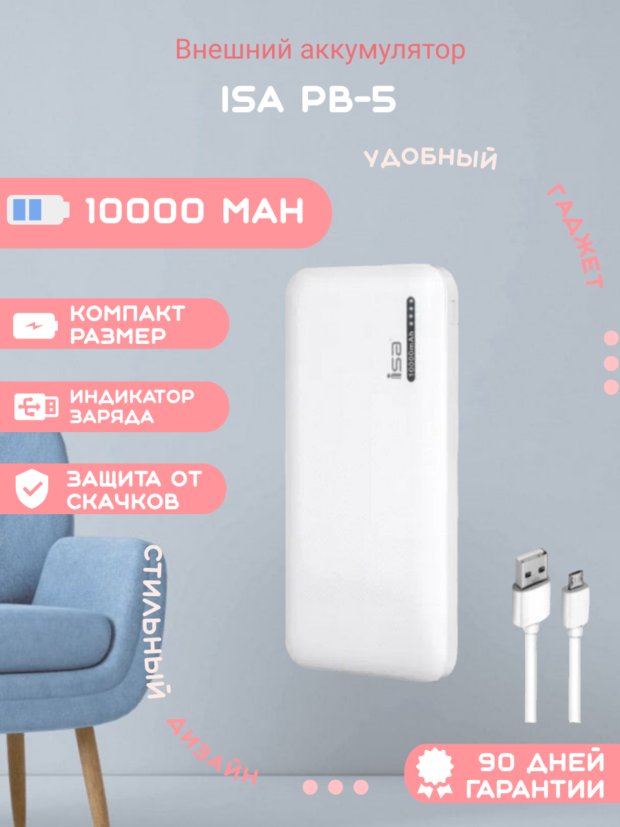 Внешний аккумулятор Power bank ISA PB-5 10000 mah, белый / Повербанк / Аккумулятор для телефона / Power bank 10000 mah