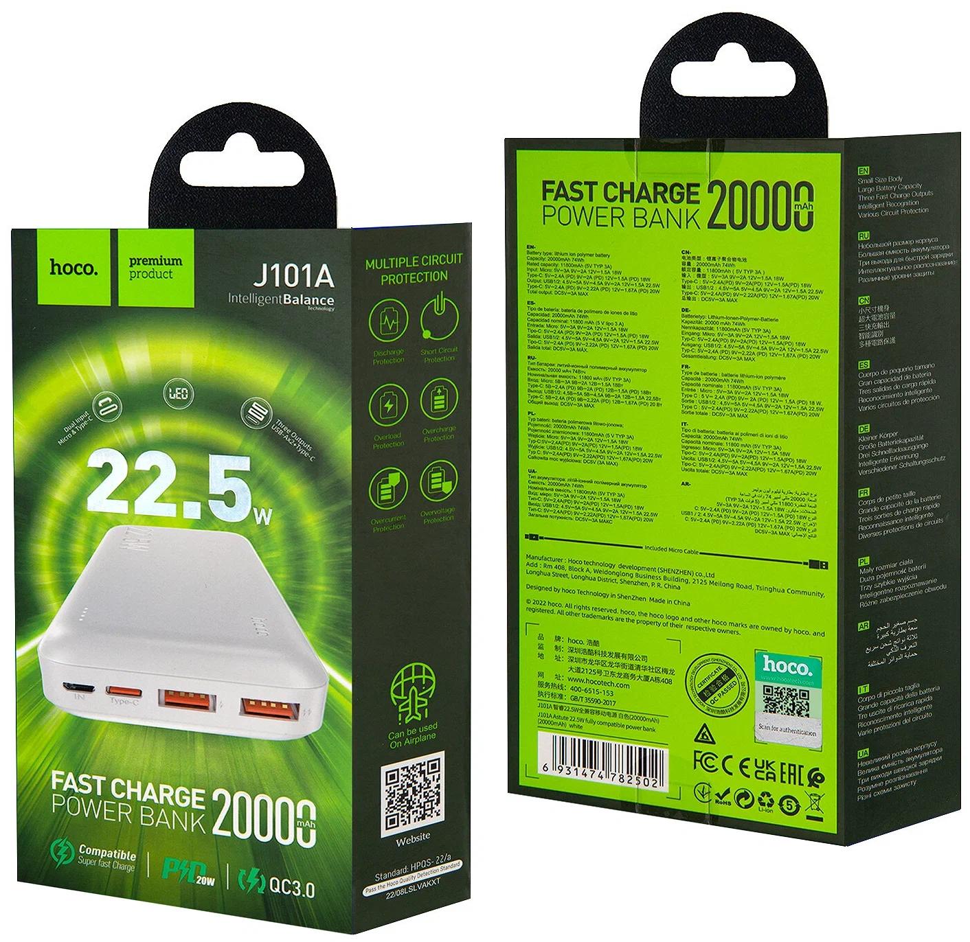 10 цен на Аккумулятор внешний универсальный Hoco J101А 20000 mAh Astute PD22.5W+QC3.0 power bank (2USB:5V-4.5A/ Type-C: 5V-2.4A) Белый