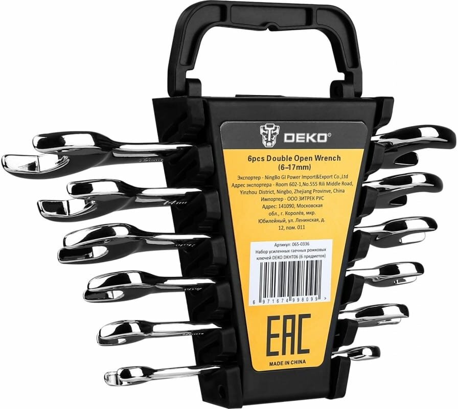| Дополнительная информация | Набор усиленных гаечных рожковых ключей DEKO DKHT06 (6 предметов). Ключи изготовлены из хромванадиевой стали. Комплектация: 6 шт ключи 6/7, 8/9, 10/11, 12/13, 14/15, 16/17 мм. |