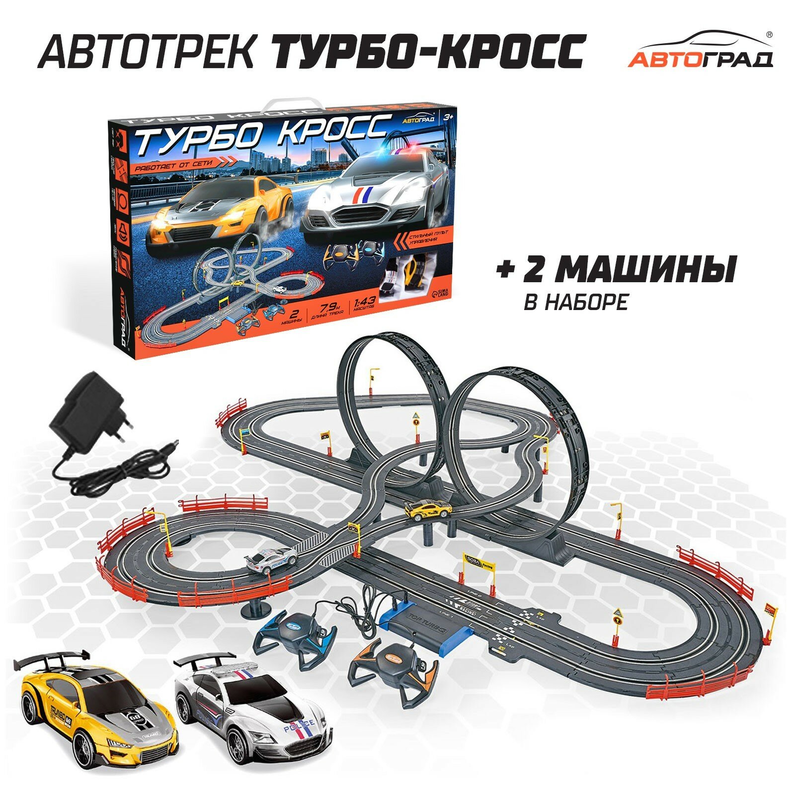 Автотрек TOP TURBO, с 2 машинами 1:43, длина 7,9 м., работает от сети 6989366 информация: