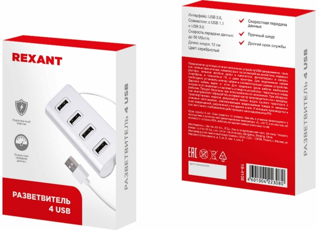 Разветвитель Rexant, 4 USB, 12 см, серебристый информация: