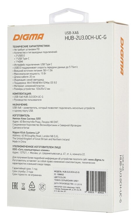 Разветвитель USB-C Digma HUB-2U3.0СAU-UC-G 5порт. серый информация: