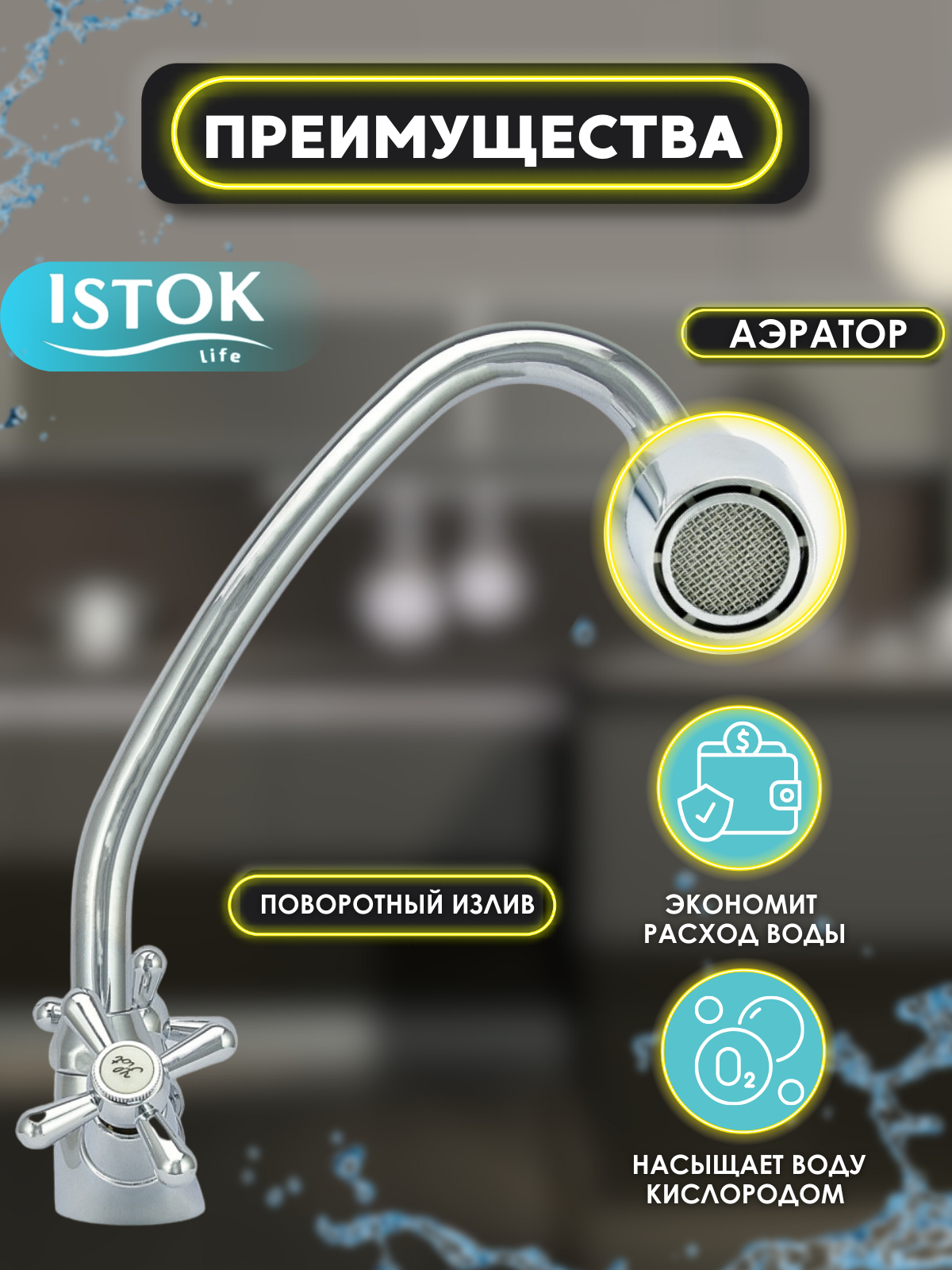 Отзывы на Смеситель латунный для мойки двуручный Istok life с поворотным изливом, керам. Кран букса, гайка, 0402.434