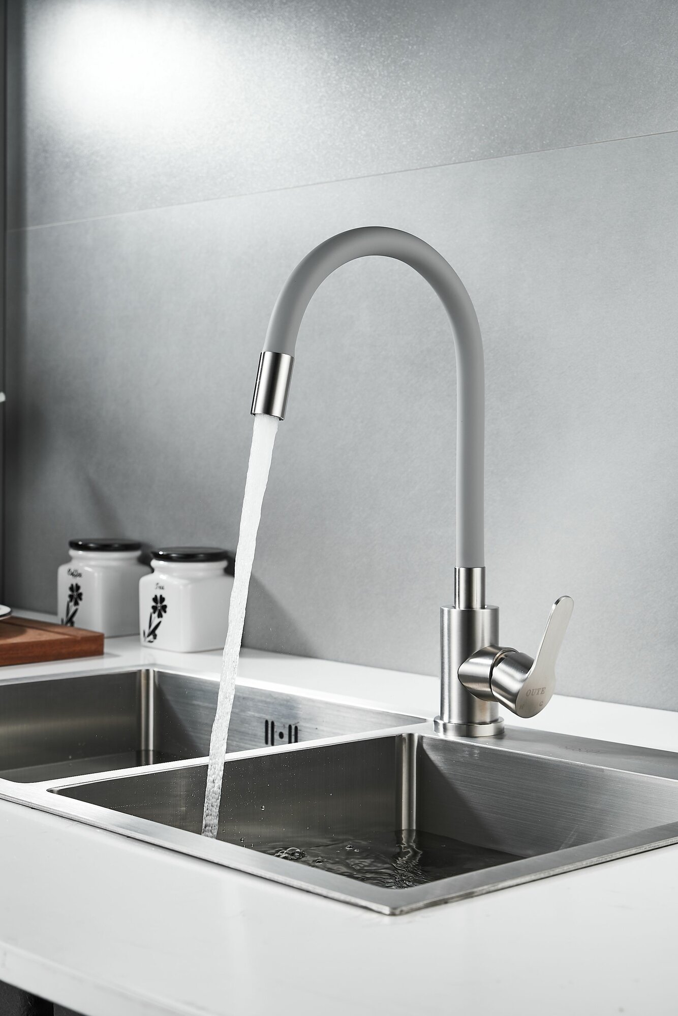 10 цен на Смеситель для кухни OUTE из нержавеющей стали SUS 304 цвет матовый хром с серым гибким силиконовым изливом