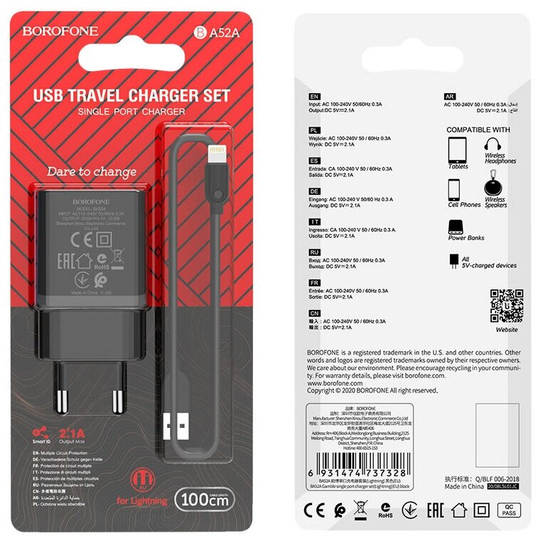 Сетевое зарядное устройство c USB Borofone, BA52A,+Lightning черное 2.1A информация: