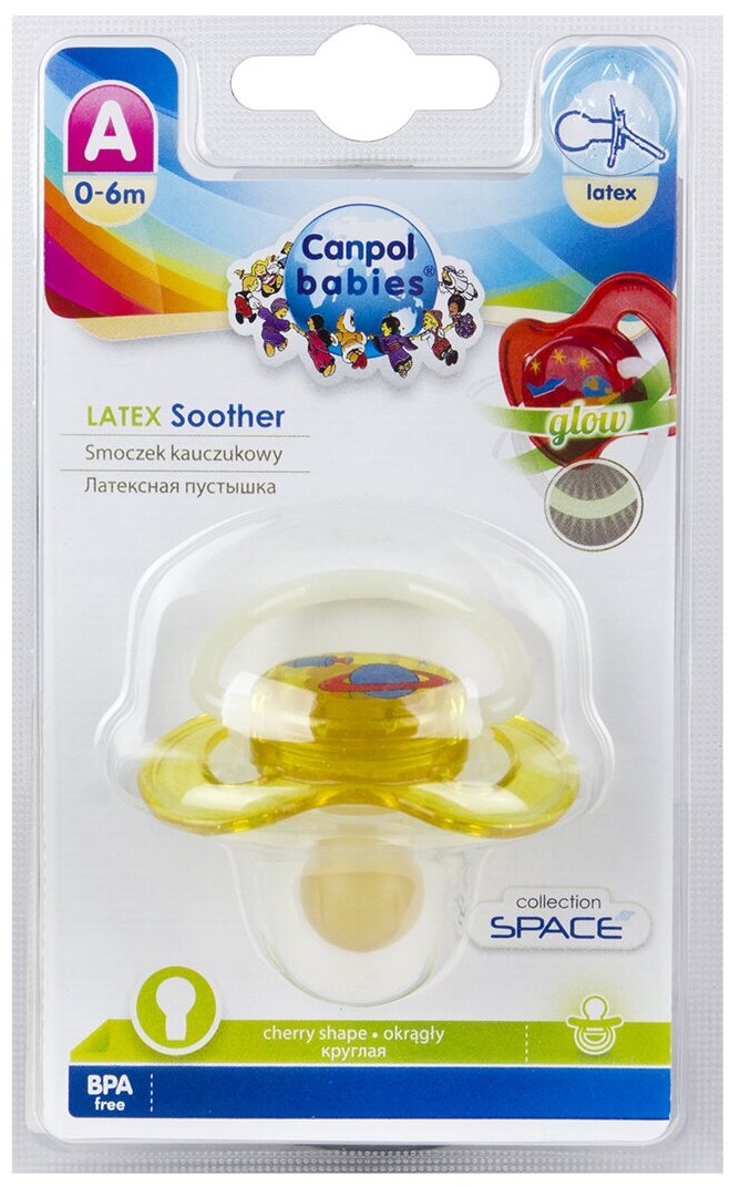 Пустышка латексная Canpol babies Space круглая, 0-6 мес, желтая
