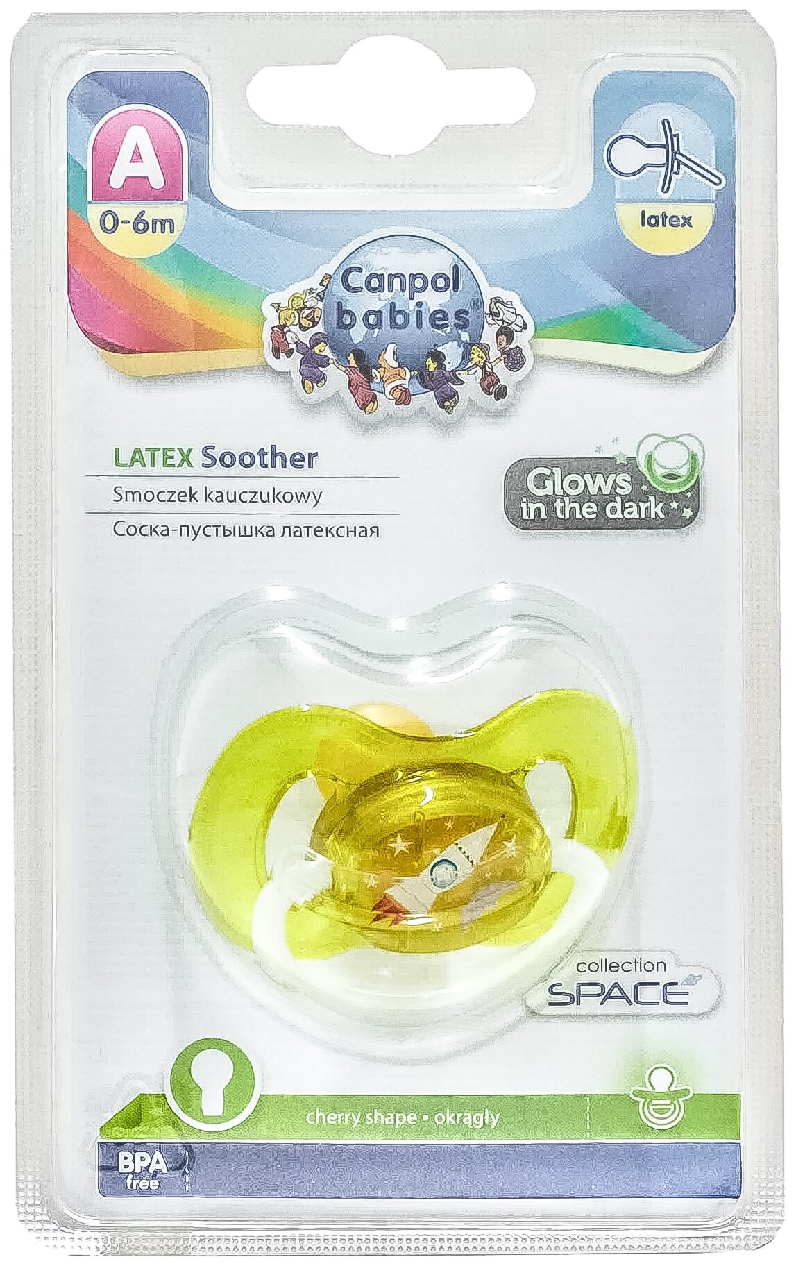 Пустышка латексная Canpol babies Space круглая, 0-6 мес, желтая