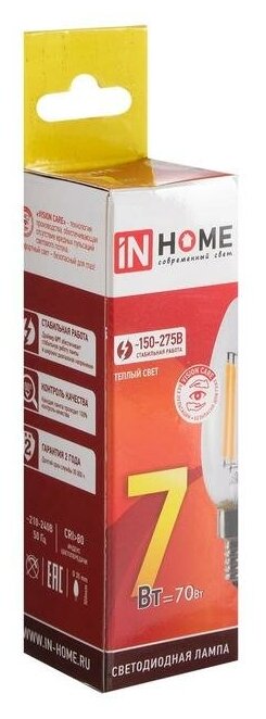 Лампа светодиодная IN HOME, Е14, С37, 7 Вт, 630 Лм, 3000 К, теплый белый, прозрачная