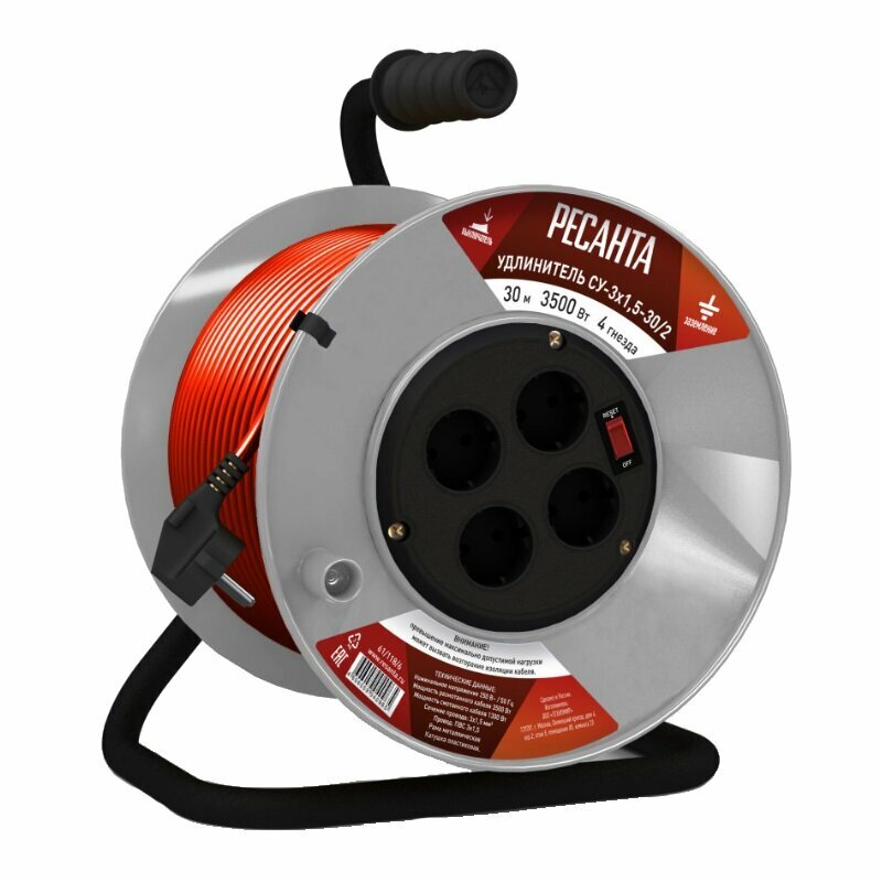 Удлинитель силовой на металлической катушке, СУ-3х1,5-30/3 (с выкл., 4 розетки, IP44) Ресанта информация: