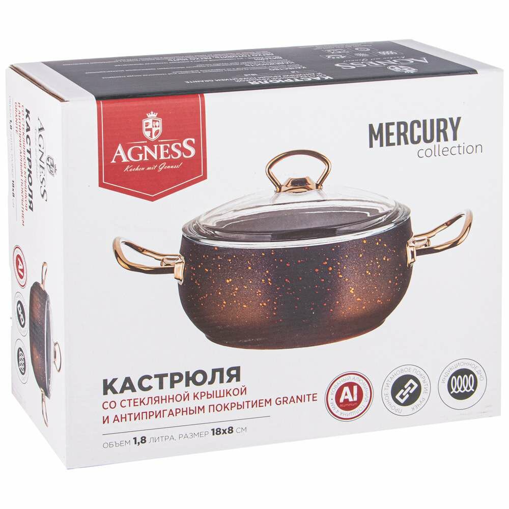 Кастрюля agness со стеклянной крышкой и антипригар. мраморным покрытием, серия mercury, 18*8 см, 1,8л KSG-953-001 информация:
