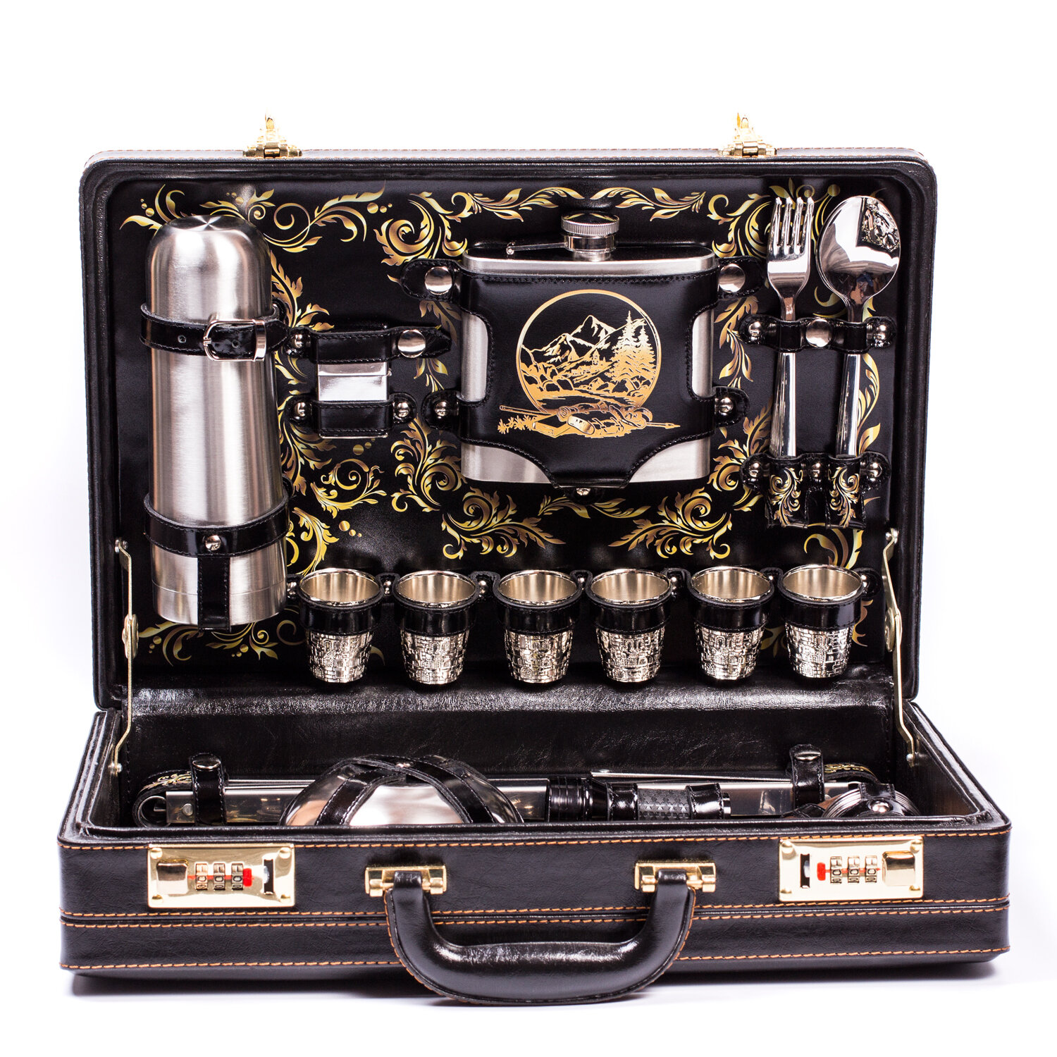 | Комплектация | Кейс из кожзаменителя с внутренней отделкой из натуральной кожи и УФ- рисунком, термос из нержавеющей стали (емкость 0,35 л.), фляжка из нержавеющей стали (емкость 0,5 л.), вилки из нержавеющей стали - 6 шт., ложки из нержавеющей стали - 6 шт., рюмки из стали с никель-серебряным покрытием - 6 шт., мангал складной из нержавеющей стали, шампуры из нержавеющей стали - 6 шт., нож охотничий из нержавеющей стали и рукоятью из ореха и латуни, тарелки из нержавеющей стали - 6 шт., стаканы из нержавеющей стали - 6 шт., зажигалка, воронка из нержавеющей стали для заполнения фляжки, штопор сомелье, фонарик светодиодный, вилка из нержавеющей стали для мяса, чехол для кейса из высокопрочного прозрачного пластика, предназначенный для защиты от влаги и сохранения товарного вида |