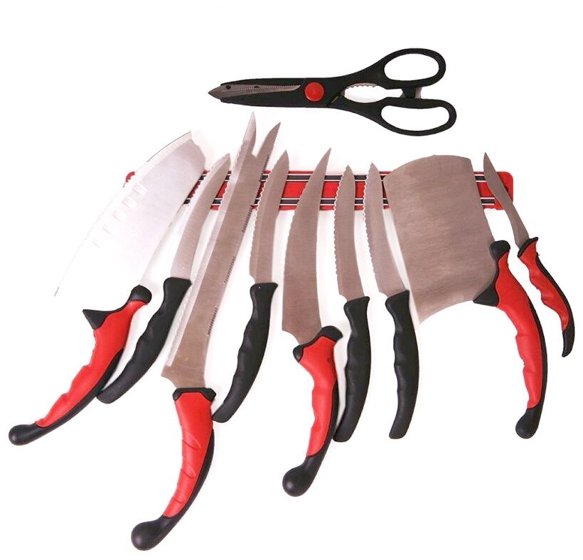 | Комплектация | 1 универсальный нож, 1 филейный нож, 1 нож для рубки мяса, 1 нож для чистки овощей, 4 ножа для стейка, ножницы, инструкция |